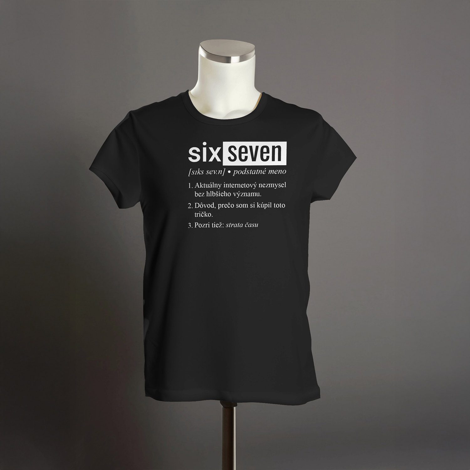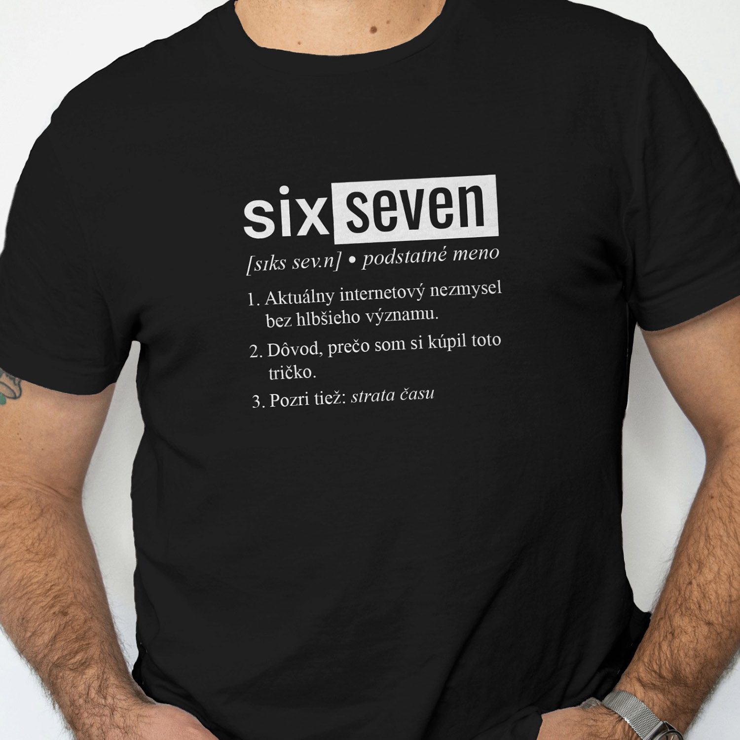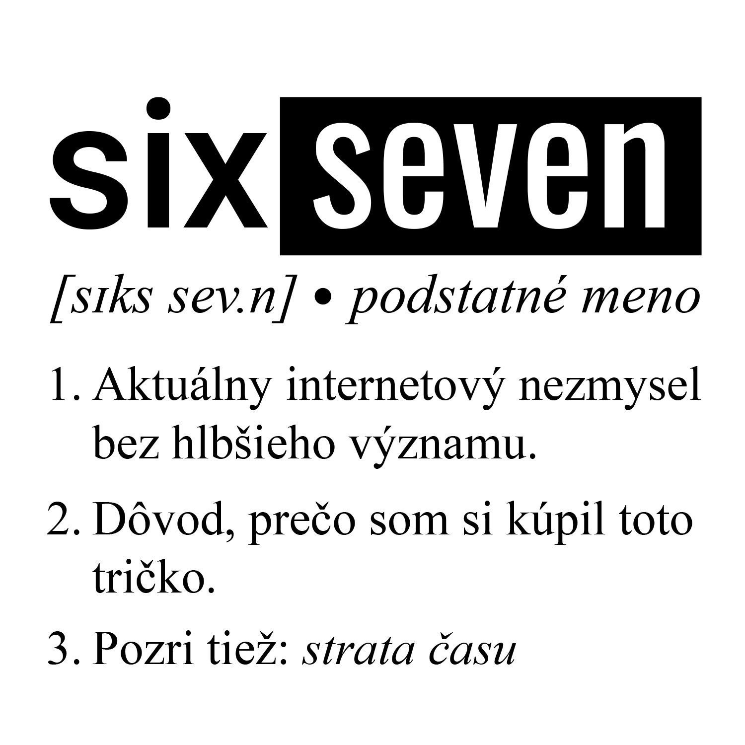 Čo hovorí potlač? Dizajn je štylizovaný ako výstrižok z moderného slovníka. Pod fonetickou výslovnosťou [sɪks ˈsev.n] nájdeš tri brutálne úprimné body: