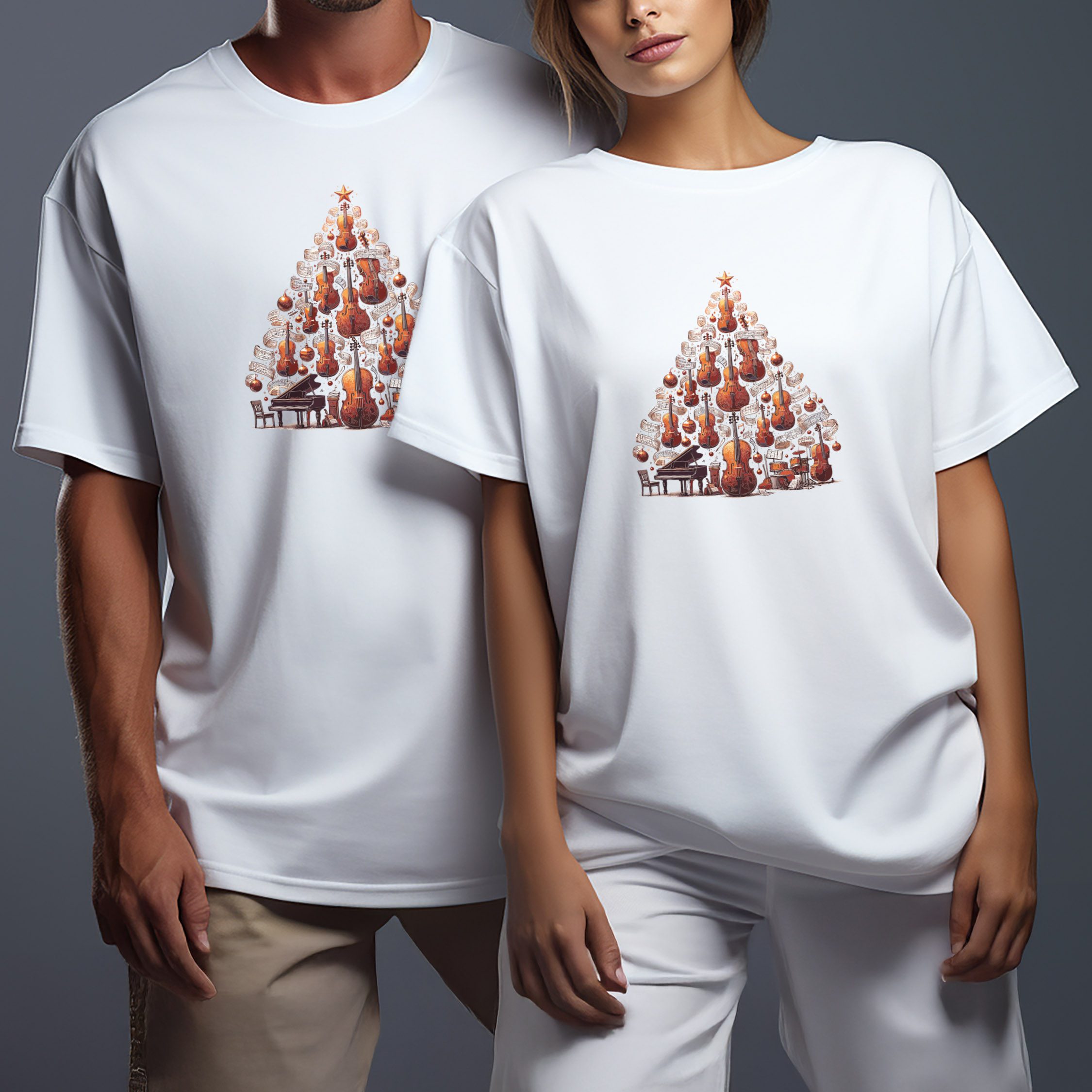 Oživte svoje vianočné outfity týmto originálnym tričkom. Vianočný stromček zložený z hudobných nástrojov je oslavou hudby a vianočných sviatkov. Získajte pohodlné a štýlové tričko, ktoré upúta každý pohľad.